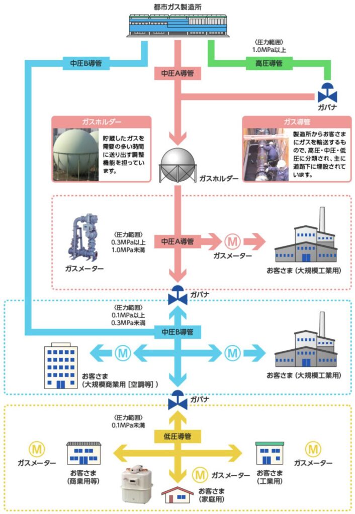 都市ガス(天然ガス)は、以下の流れで運ばれます。