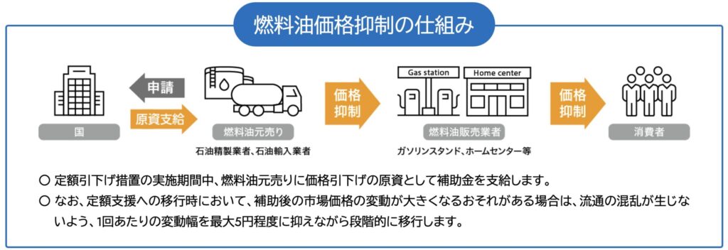石油元売り各社(ENEOSやコスモ石油など)に対して国が直接補助金を交付することで、ガソリンスタンドの店頭価格を一定水準以下に抑えることを目的とした制度です。
