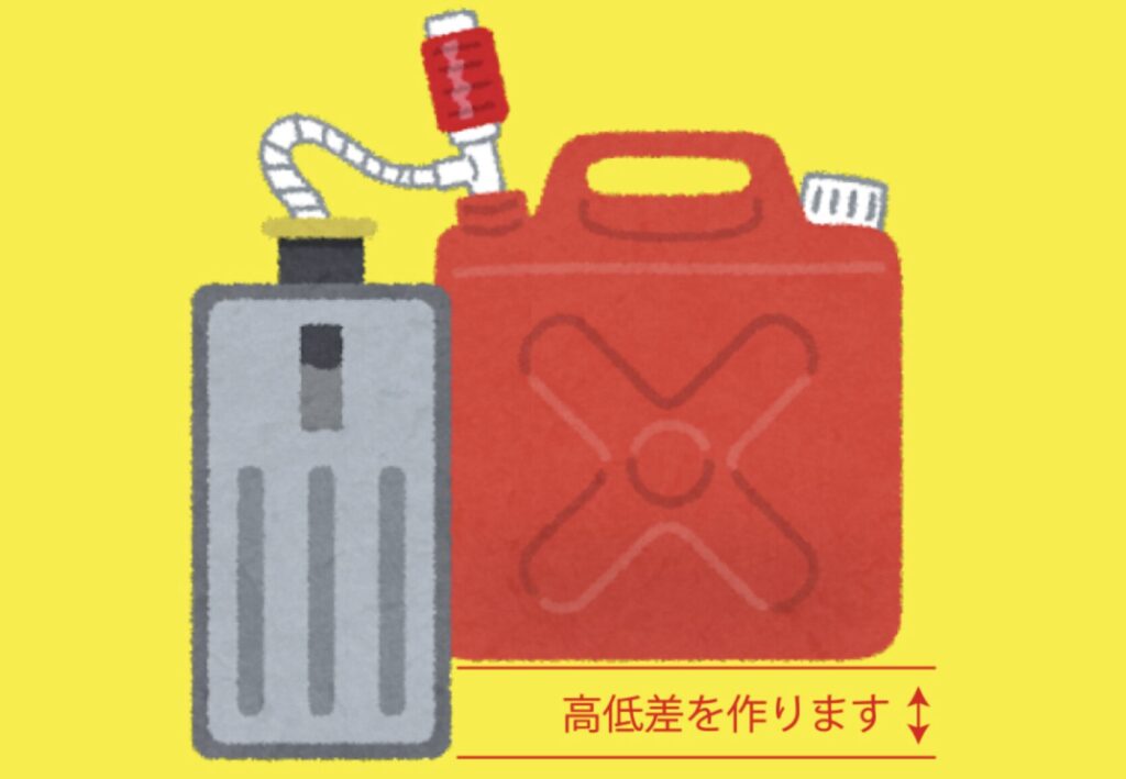 サイフォンの原理を成立させるためには、ポリタンクの液面が、給油先より高い位置にあることが必須です。