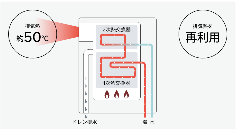 従来型では外に逃げていた高温の排気ガスから“もう一度熱を取り戻す”構造を持ち、給水を事前に温めることで効率を大きく引き上げます。
