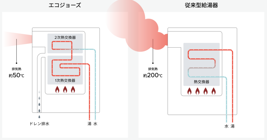 | 比較項目 | 従来型給湯器 | 潜熱回収型給湯器 |