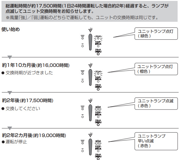 説明書をよく読むと「交換時期」や「運転停止」の記載はあるものの、実際には