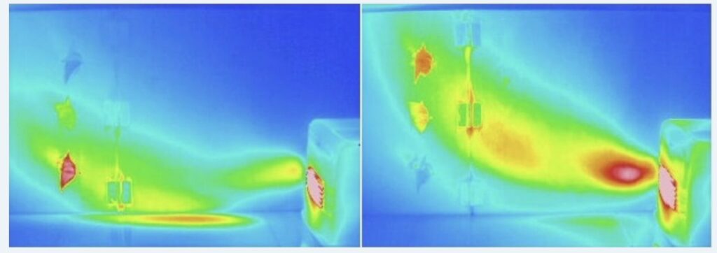 温風は吹き出した直後は床付近を進みますが、流れが弱かったり、途中で乱れたりすると、