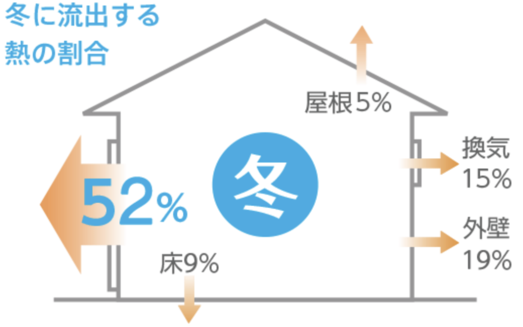 特に窓に関しては冬に流出する熱の割合が52%と高いので、コールドドラフト対策として断熱カーテンなどで対策するのもありでしょう。