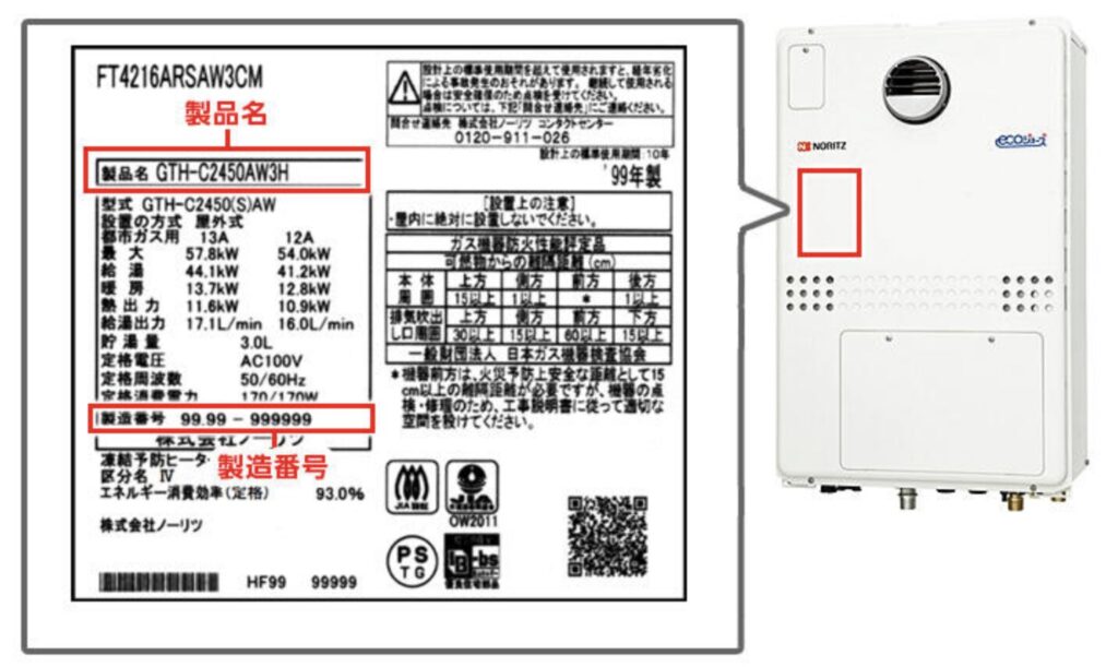 ここには製造年や型式が記載されており、給湯器がいつ作られたものかを正確に把握できます。
