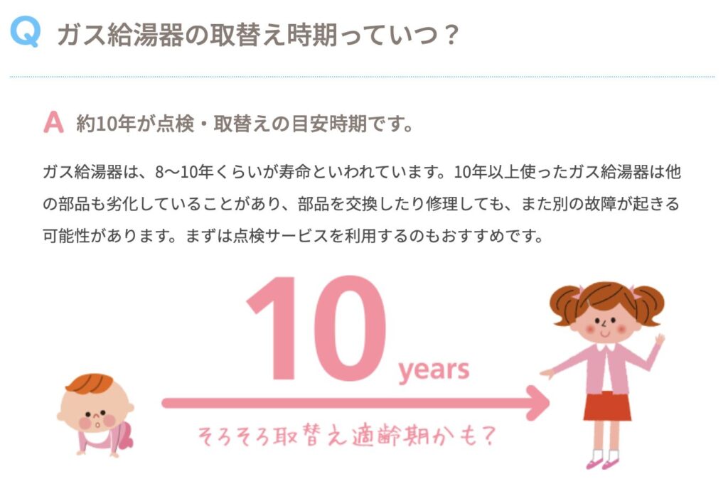 都市ガス・LPガスを問わず、一般的なガス給湯器の寿命は約10年がひとつの基準です。